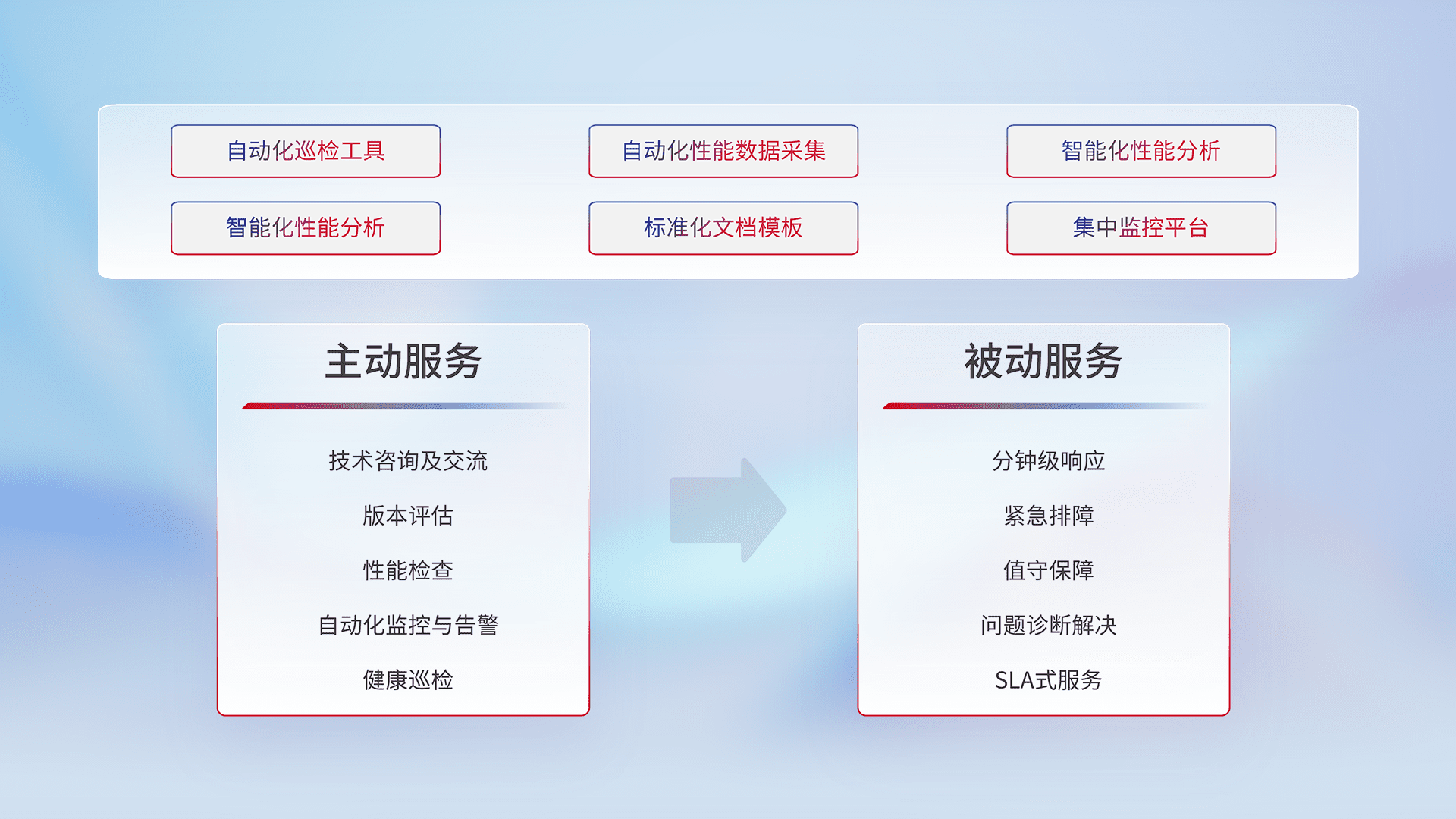 智能化工具和标准化文档,,保障服务质量,,提供主动服务(包含技术咨询、、版本评估、、、、性能检查、、、自动化监控与告警、、健康巡检)和被动服务包含(分钟级响应、、、紧急排障、、值守保障、、、问题诊断解决、、、、SLA服务)。。。