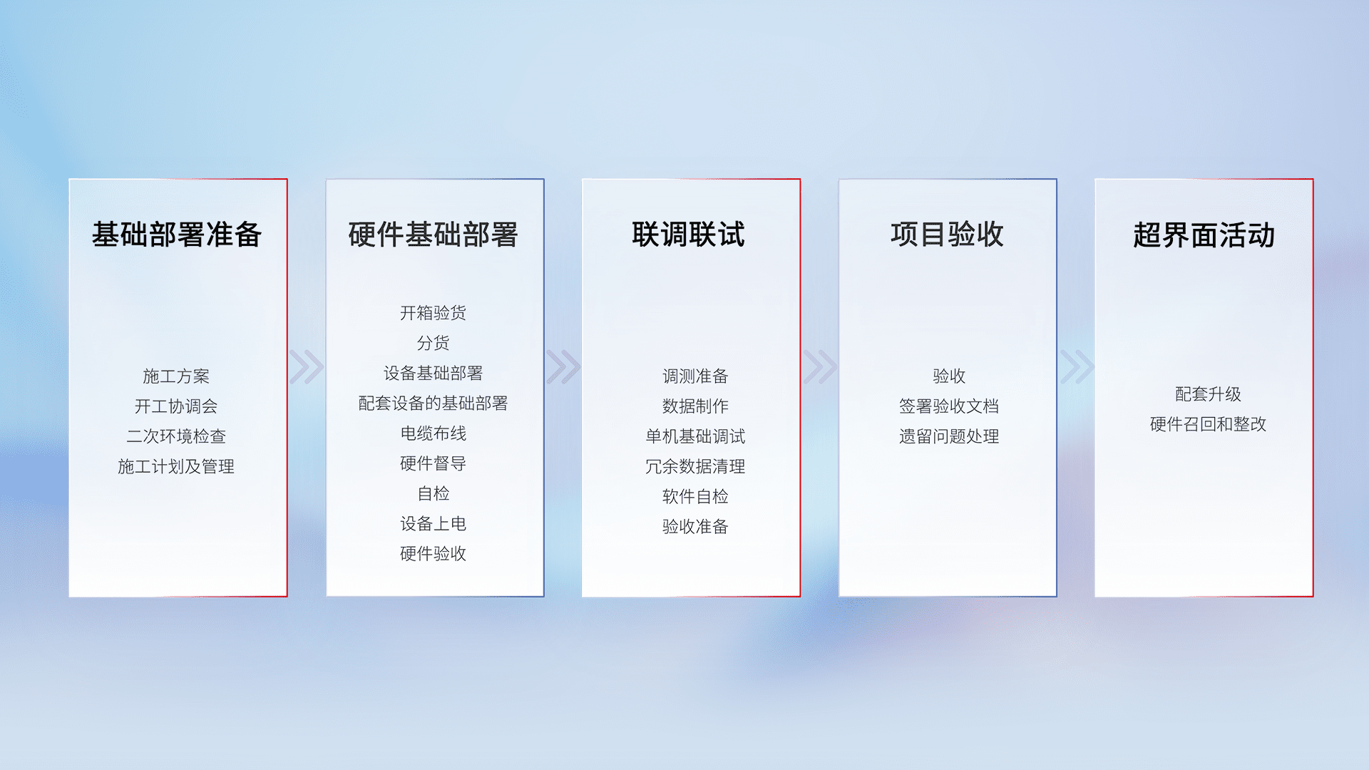 从基础部署准备、、、硬件基础部署、、、联调联试、、、、项目验收、、越界面活动的全过程可追溯,,保证施工质量和进度。。。。