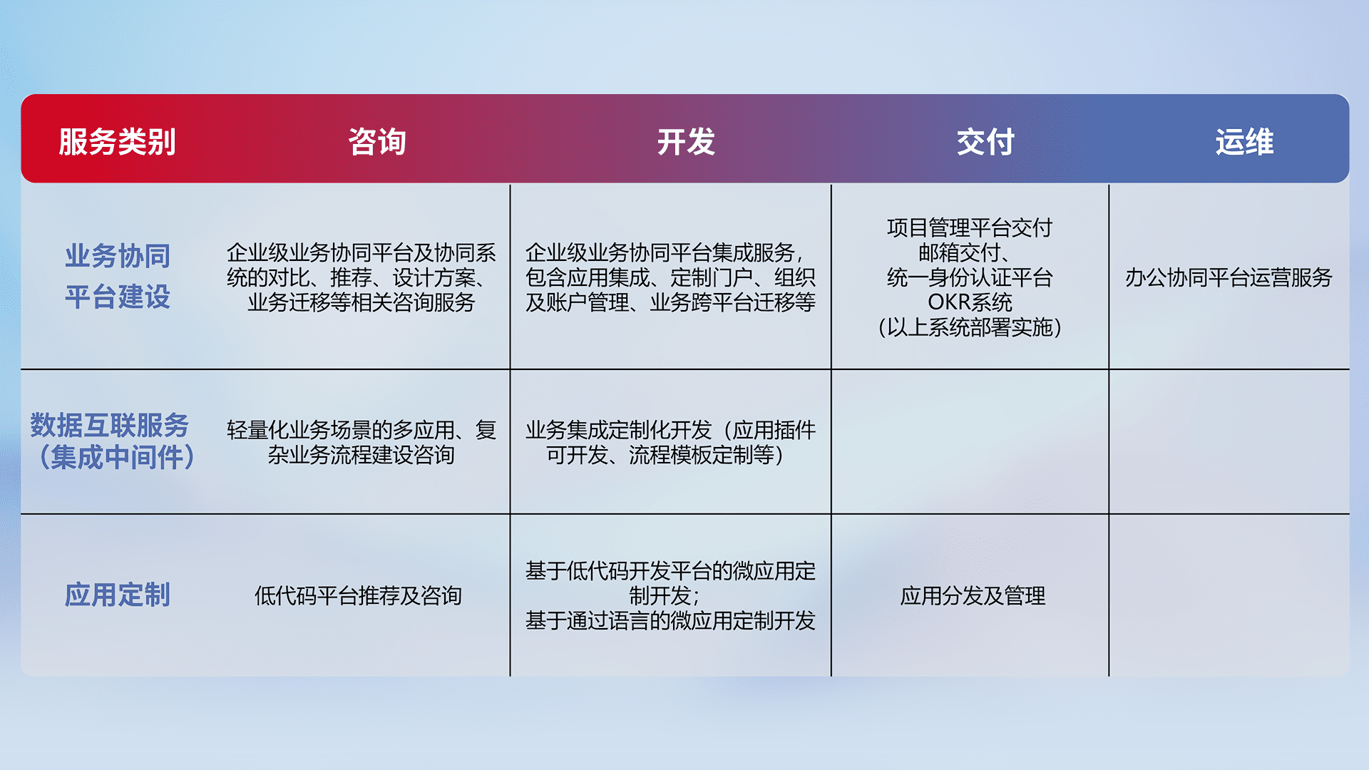 针对钉钉、、企微、、、、IDaas等平台级产品提供产品的规划、、方案、、交付、、定制化开发等服务,,实现如统一协同办公、、智能客户服务、、混合会议管理、、、智能数据查询、、、、等业务场景,,,,实现数字化转型。。